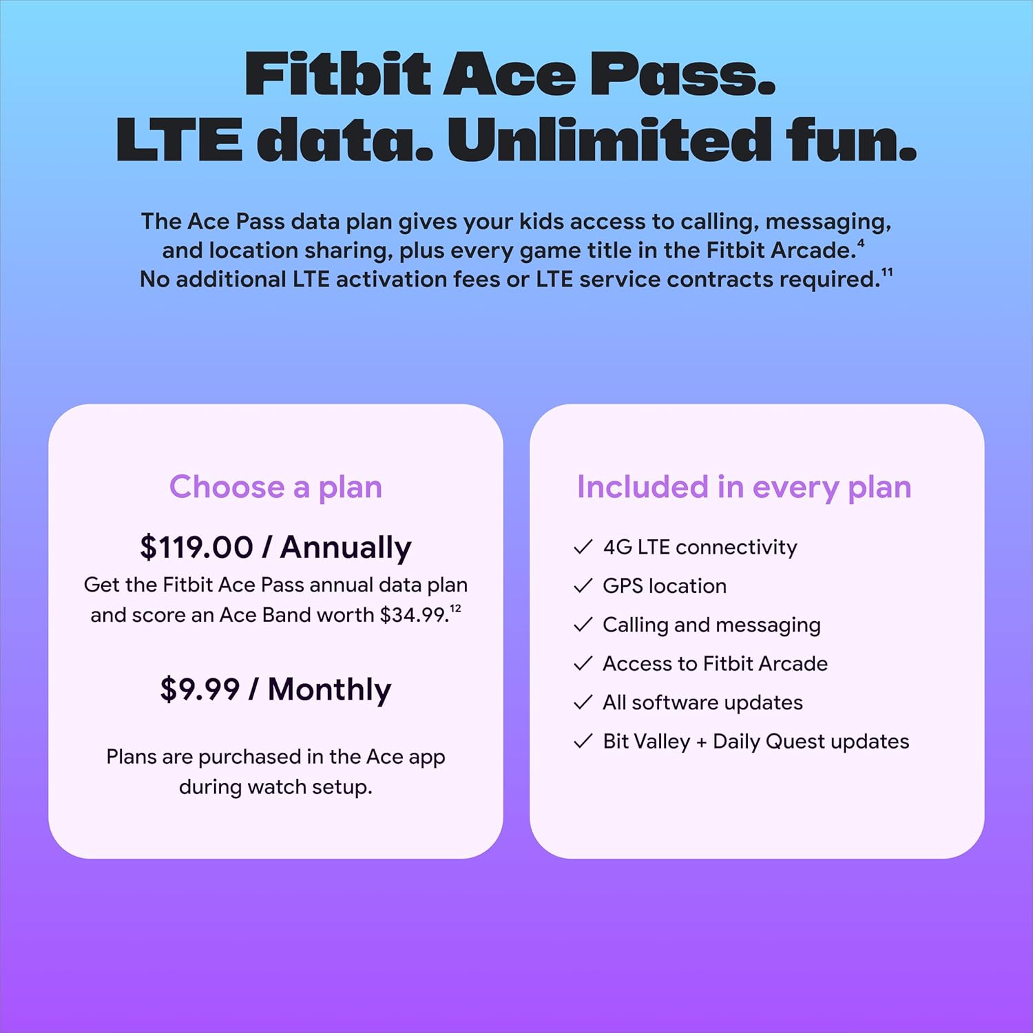 LTE DATA FOR UNLIMITED FUN – The Fitbit Ace Pass data plan gives you access to calling, messaging, and location sharing; plus, kids get every game title in the Fitbit Arcade[4,7]