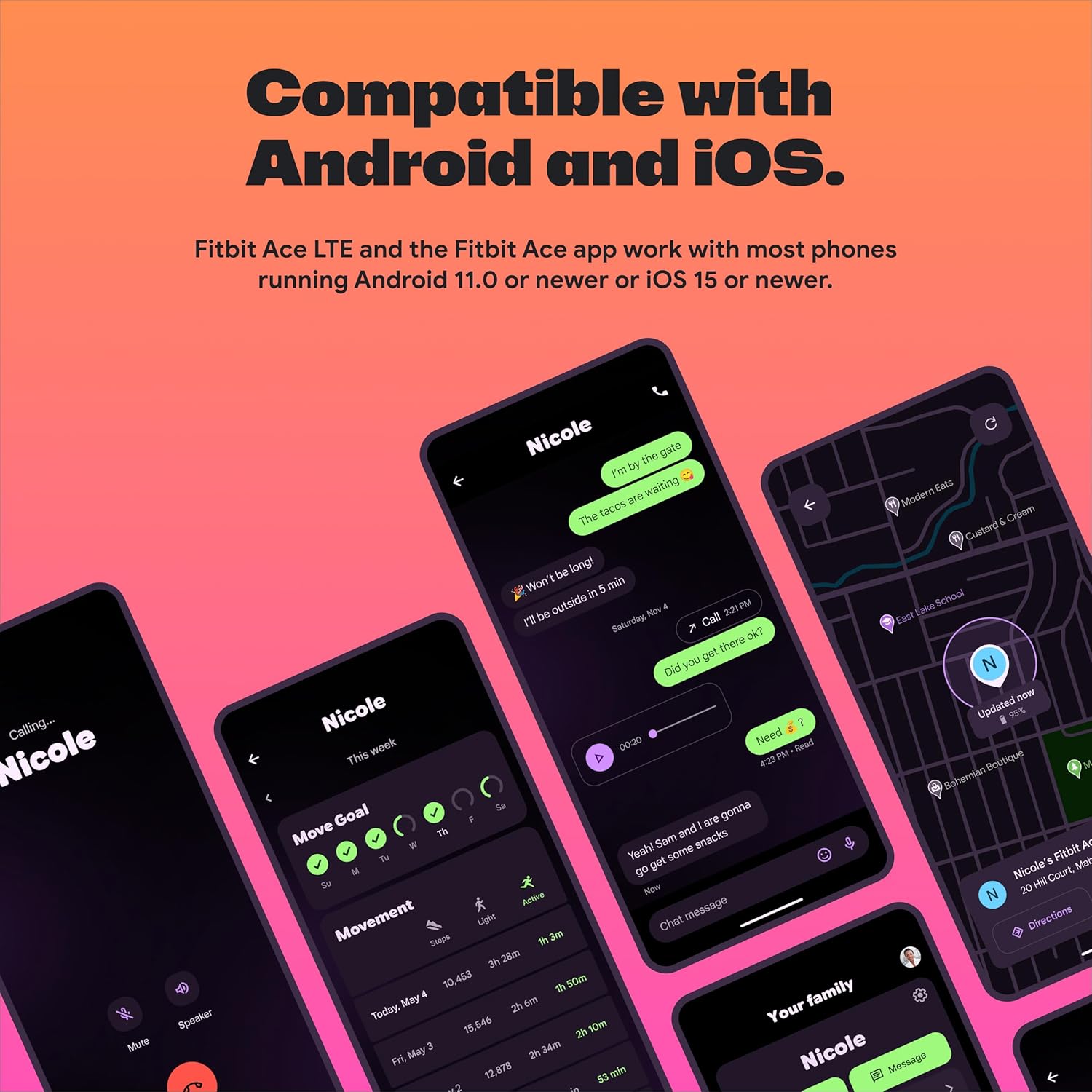 IN-APP CALLS & MESSAGES WITHOUT A PHONE NUMBER – Stay connected and add up to 20 contacts (ages 13 and up) for them to call and message with; Works with most Android 11.0 or newer or iOS 16 or newer[20,21,22]; Google account and Fitbit Ace app required.