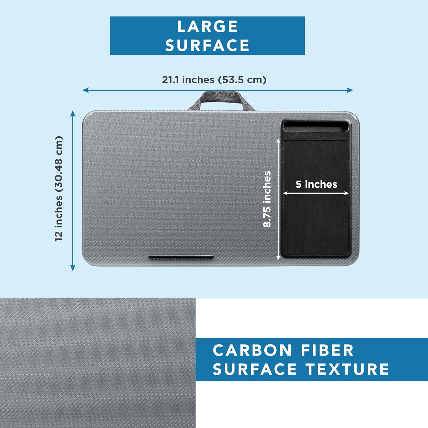Durable Surface: Work with confidence on our lap desk’s solid surface, featuring a silver carbon color, ensuring optimal air circulation to prevent your laptop from overheating.
